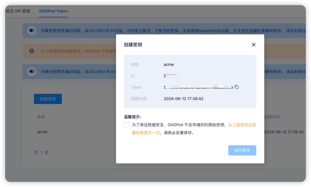 - 进入 DNSPod Token选项卡,创建密钥