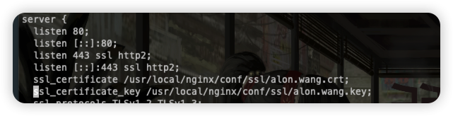 在 nginx 配置中添加ssl_certificate和ssl_certificate_key,并重新加载 nginx 配置文件nginx -s reload,使证书生效