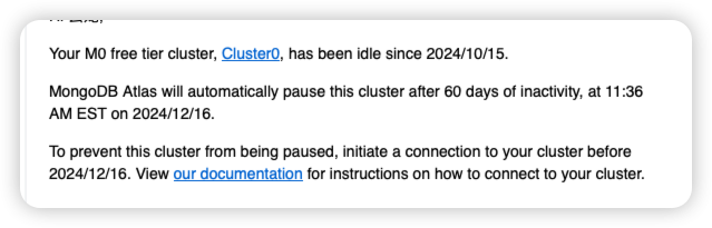 今天突然收到一封来自 MongoDB 的邮件,显示有一个数据库从10月15号开始就没有连接过了,60天不连接将会暂停。