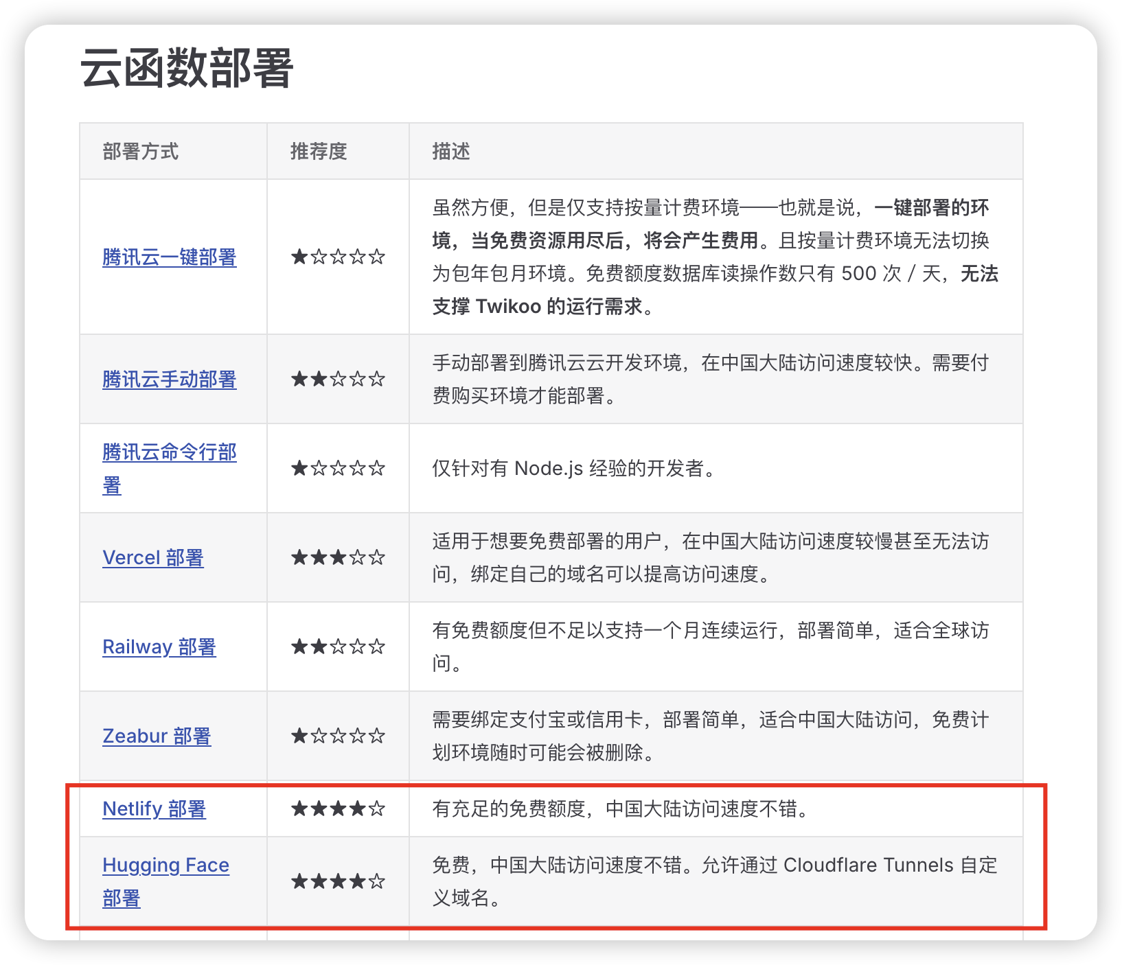 打开twikoo文档,发现 Netlify 的推荐指数与 Hugging Face 是一样的,现在 Hugging Face 不能用那就切换到 Netlify 好了。