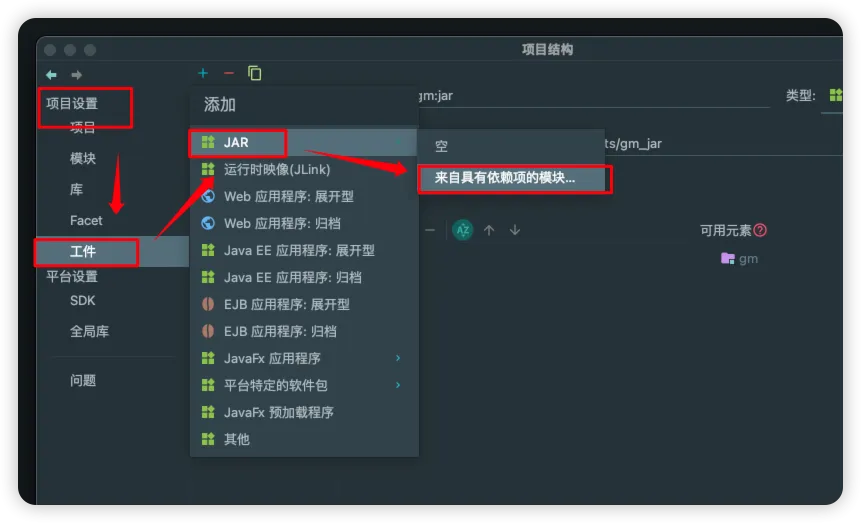 文件(File)-项目结构(Project Structure)-项目设置(Project Settings)-工件(Artifacts)-+添加(Add)-JAR-来自具有依赖项的模块(From modules with dependencies)