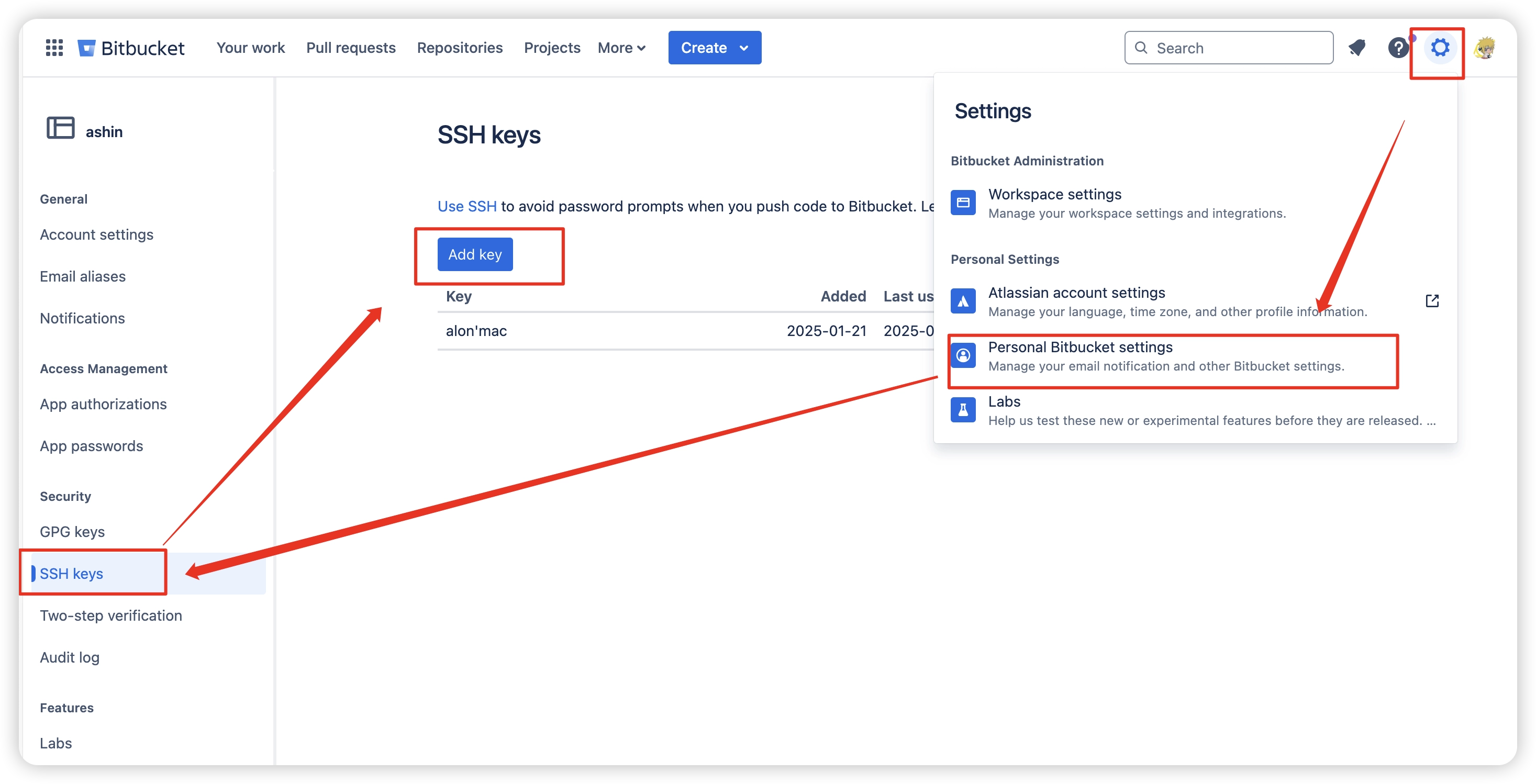 workspace,然后创建一个仓库Repository上传本地的ssh公钥到bitbucket,使用ssh拉取或更新代码