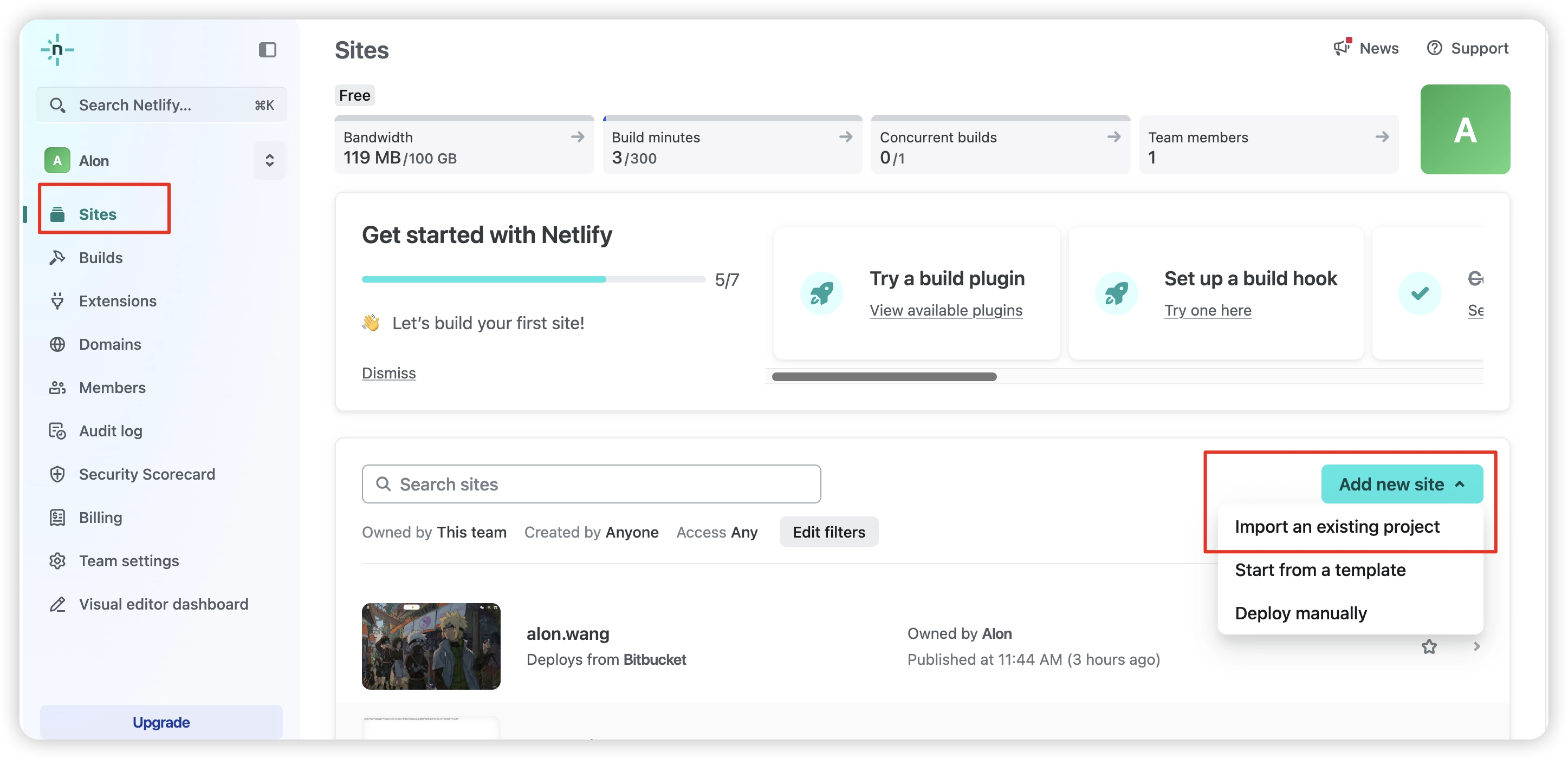之前git仓库使用的是gitee,但netlify一键部署不支持,所以新建一个bitbucket的仓库来用。别问为什么不用github,推代码总是超时,用了魔法也经常失败。裆燃啦,你用github也可以,直接跳过这一步就好