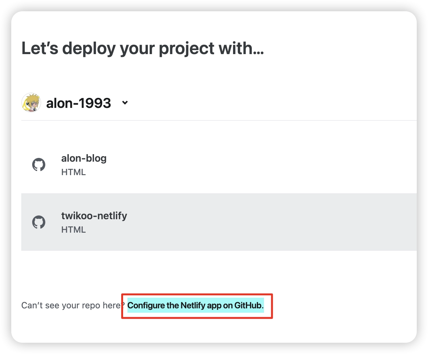 新建一个site,然后选择要关联的仓库类型,我这里选择的是bitbucket。如果关联的是github仓库,还需要点一下Configure the Netlify app on GitHub. 授权一下可以关联的仓库。选择要使用的仓库