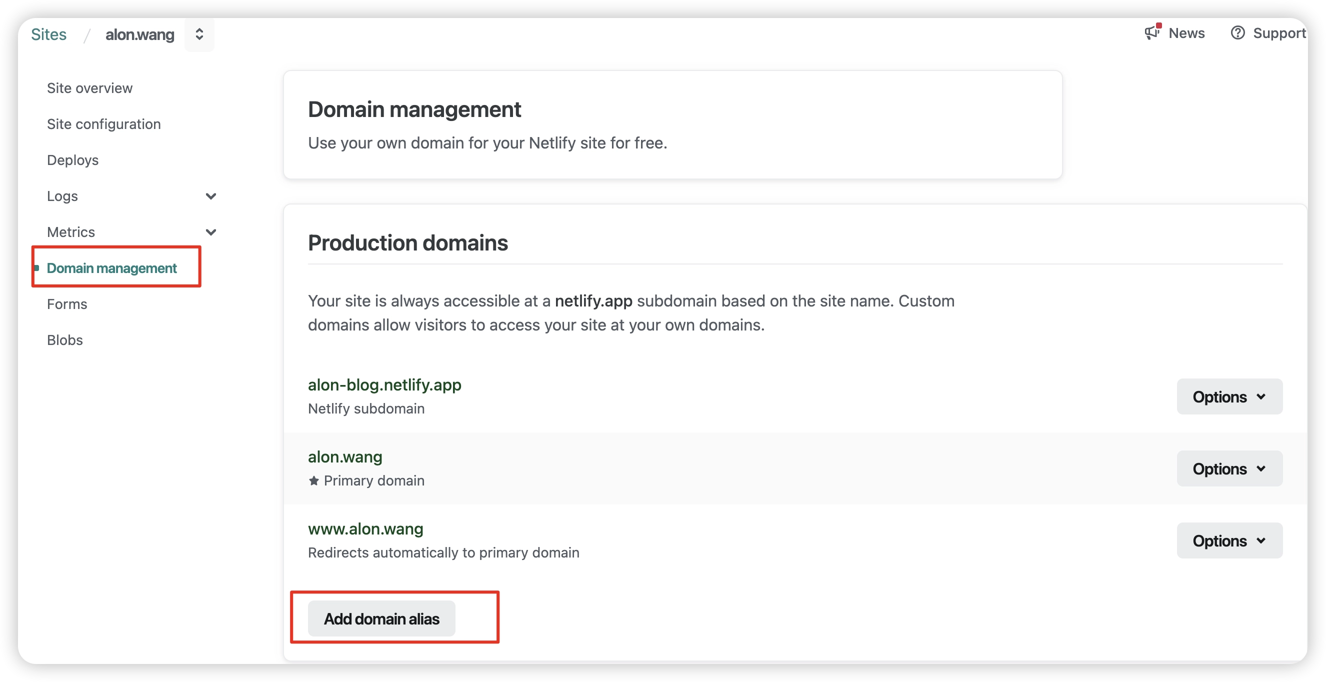 进入菜单Domain management,点击Add domain alias按钮新增一个域名。在你的域名管理平台添加一个dns解析,使用CNAME类型,添加解析记录为你的netlify site名称.netlify.app.。注意最后面是有个.的