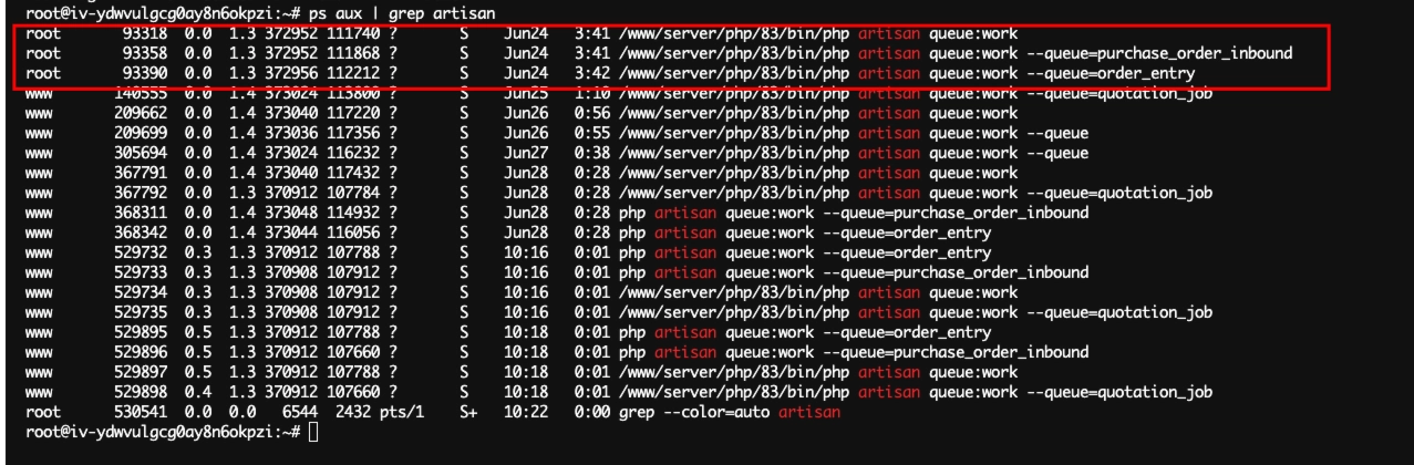 - me: 我靠!!!怎么还有这么多队列在运行?队列都停止了啊,而且三个是root用户启动的?